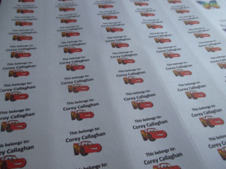 65 Self Adhesive School Name Stickers – Lightning McQueen design. Labels are personalised with name. Each label measures 3.8cm x 2.1cm and will be supplied on 1 A4 sheet.