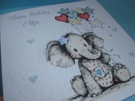 This card can be personalised with any text of your choice. Adorable Elephant with Blue Balloons birthday design, printed onto high quality white 300gsm card. Card measures 14.7cm x 14.7cm and is supplied with white envelope.