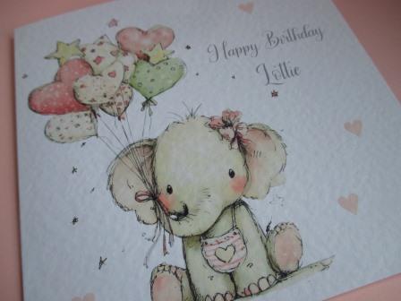 This card can be personalised with any text of your choice. Adorable Elephant with Pink Balloons birthday design, printed onto high quality white 300gsm card. Card measures 14.7cm x 14.7cm and is supplied with white envelope.