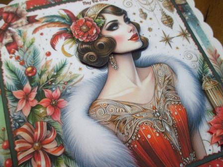 This card can be personalised with a message of your choice. Art Deco Woman Christmas design, mounted onto high quality 300gsm scalloped edge card base and layered for a 3D effect. Card measures 14.8 x 14.8cm and is supplied with white envelope.