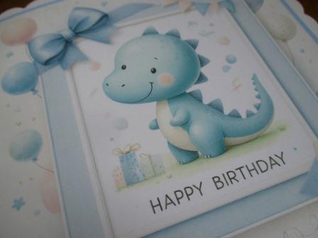 This card can be personalised at the top with a message of your choice. Baby Dinosaur design, mounted onto 300gsm scalloped card base. Card measures 14.7cm x 14.7cm and is supplied with white envelope.