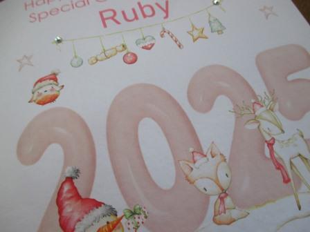 This card can be personalised with any relation and name of your choice. Woodland Theme 2025 Christmas card in pastel pink, printed with text of choice onto high quality white 300gsm card. Embellished with sparkly gems.Card measures 14.7cm x 14.7cm.