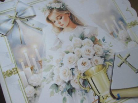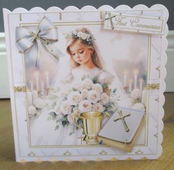 This card can be personalised with any name, relation and date. Blonde Girl Roses Communion design, mounted onto high quality card base and layered for a 3D effect. Card measures 14.8cm x 14.8cm.