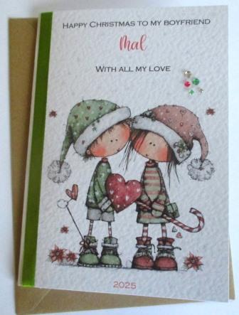 The personalisation on this card suggests boyfriend, but this card can be personalised with message of your choice, i.e. husband, Fiance, Wife, girlfriend etc. Cosy Couple Christmas design, printed on white hammered 300gsm thick card. Finished with satin ribbon and sparkly gems. Insert is white smooth 180gsm card and is blank for you to write your own message. Card is A5 in size and is supplied with natural Kraft envelope.