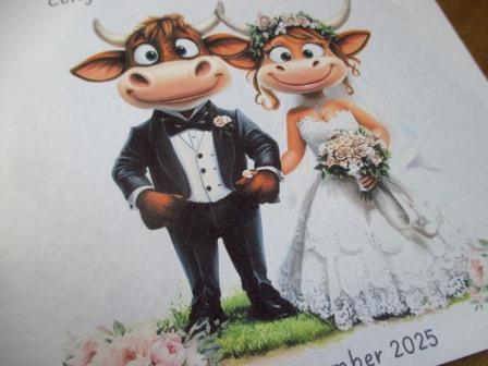 This card can be personalised with any message of your choice. Cow Themed Wedding design, printed with text onto high quality 300gsm white card base. Card measures 14.8cm x 14.8cm. Supplied with white envelope.