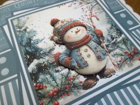 This card can be personalised with a message of your choice. Cutest Little Snowman Christmas design, mounted onto high quality 300gsm scalloped edge card base with design layered for a 3D effect. Card measures 14.8 x 14.8cm and is supplied with white envelope.