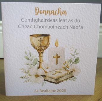 This card can be personalised with any name of your choice. Unisex Golden Chalice GAELIC Communion design, printed with text of your choice onto high quality 300gsm white hammered card. Card measures 14.8cm x 14.8cm and is supplied with white envelope.