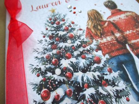 This card can be personalised with text of your choice. Special Couple Christmas design, printed on white hammered 300gsm thick card. Finished with organza ribbon and sparkly gems. Insert is white smooth 180gsm card and is blank for you to write your own message. Card is A5 in size and is supplied with red envelope. (NB Supplied with image as shown – hair colours cannot be altered on this design)