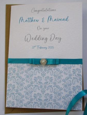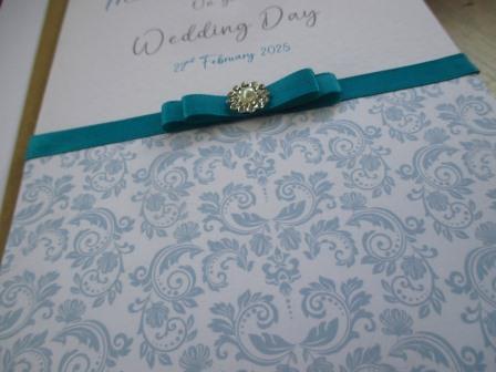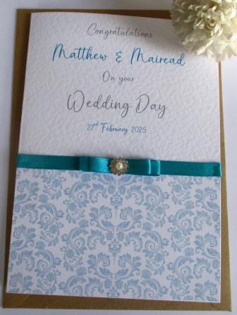 This card is personalised with names of bride and groom and wedding date. Teal Damask Bow Wedding design, printed on white hammered 300gsm thick card. Finished with ribbon, dior bow and sparkly embellishment. Insert is white smooth 180gsm card and is blank for you to write your own message. Card is A5 in size and is supplied with natural kraft envelope.