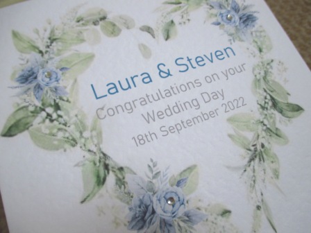 This card can be personalised with any text of your choice. Watercolour Heart Blues Wedding design, printed with text of choice onto high quality white 300gsm card and embellished with gems. Card measures 14.7cm x 14.7cm.