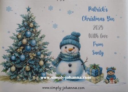 2 Extra Large A5 Personalised Self Adhesive Blue Snowman Christmas Treat Box Stickers. These 2 stickers can be personalised with 1 name per sticker, i.e 2 names on the sheet “Patrick’s Christmas Box” twice or a different name on the 2nd sticker. The “From” message can be personalised too, i.e. From Mam & Dad, Santy, Santa, Auntie, etc