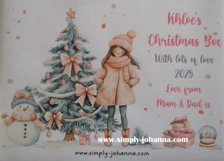 2 Extra Large A5 Personalised Self Adhesive Pink Girl Christmas Treat Box Stickers. These 2 stickers can be personalised with 1 name per sticker, i.e 2 names on the sheet “Khloe’s Christmas Box and Lisa’s Christmas Box” or 2 stickers of the same name. The “From” message can be personalised too, i.e. From Mam & Dad, Santy, Santa, Auntie, etc